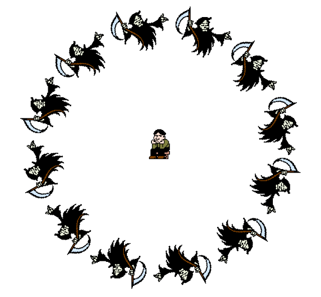 - The Doomed Man is alive and surrounded by a loop of Grim Reapers. It is the Grim Reapers’ job to kill any Doomed Man — and they enjoy doing it!