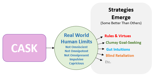 These strategies — rules, robust character guides called “virtues,” clumsy goal-seeking, and gut intuitions — emerge when CASK collides with the “real world” of human limitations.