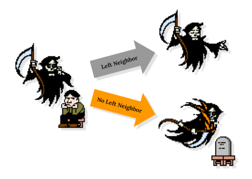 Irene, however, points out that we’re still in a pickle. That’s because an alternative #3 is perfectly conceivable: That the Grim Reapers have a manner that, if they lack a Grim Reaper on their left, they will instead defer to a Grim Reaper on their right (if there is one). Instead of an endlessly cyclic deferral, you get an endlessly zig-zagging deferral.