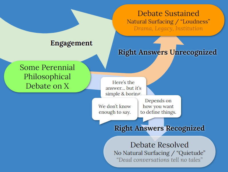 These right answers are boring, they can’t be capitalized, and they end conversations. These three nails in the memetic coffin help explain philosophy’s problem with heuristic capture (in short, those whose careers & names are wholly invested in there being “more to it” cannot be trusted when they say “there’s more to it,” despite them being genuinely honest, intelligent, respectable, and endorsed by their peers — heuristics we like to lean on).
