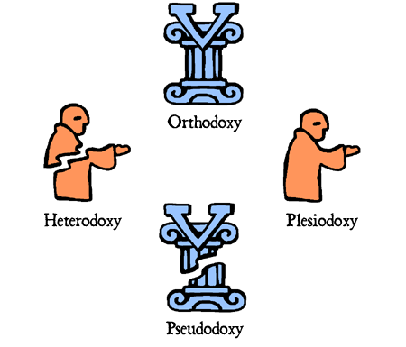 So we’d have “orthodoxy,” true doctrine, as opposed to “pseudodoxy,” false doctrine. And we’d have “heterodoxy,” different than our tradition, as opposed to “plesiodoxy,” near to our tradition.