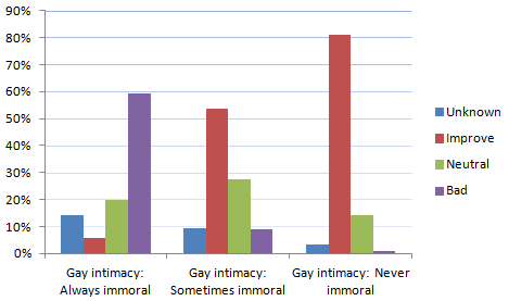 Percentage “Morality of gay intimacy” against “Effect of acceptance of gay marriage on society, ‘bad effects’ clamped.”