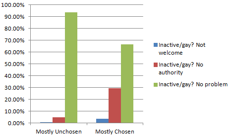 Percentage “Homosexuality chosen?” against “Response to inactive homosexuals in church.”