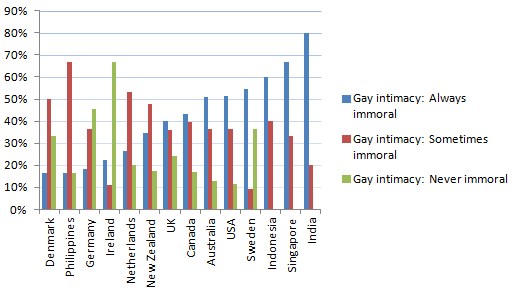 Percentage “Country, >4 responses” against “Morality/immorality of gay intimacy.”