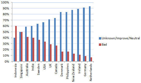 Percentage “Country, >4 responses” against “Social effect of gay marriage acceptance, clamped to ‘Unknown/Neutral/Improve’ vs. ‘Bad.'”